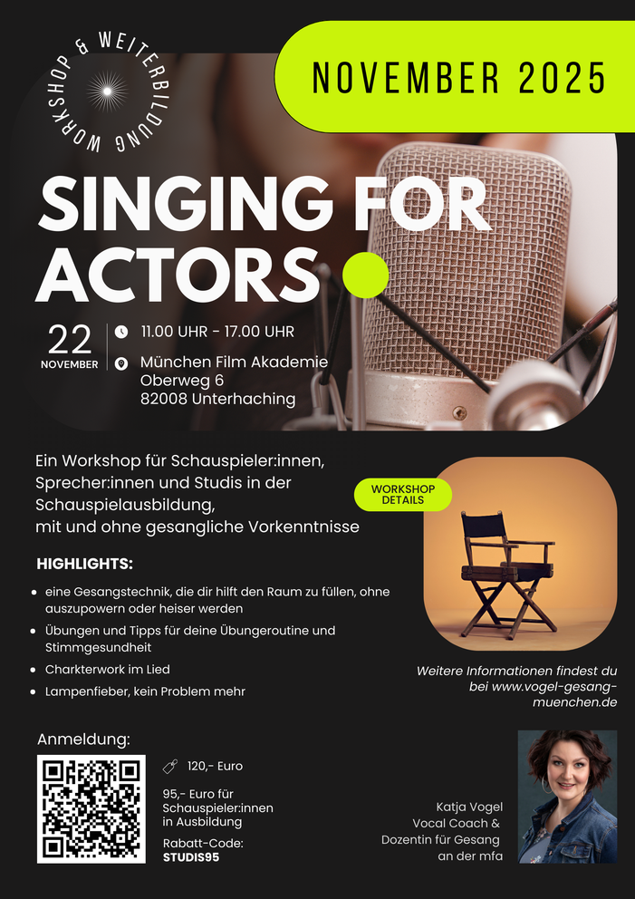 Dieser Workshop ist speziell für Schauspieler:innen, Sprecher:innen und Bühnenmenschen aller Erfahrungsstufen, die ihr stimmliches Potenzial und Repertoire erweitern und mit Selbstvertrauen singen möchten.